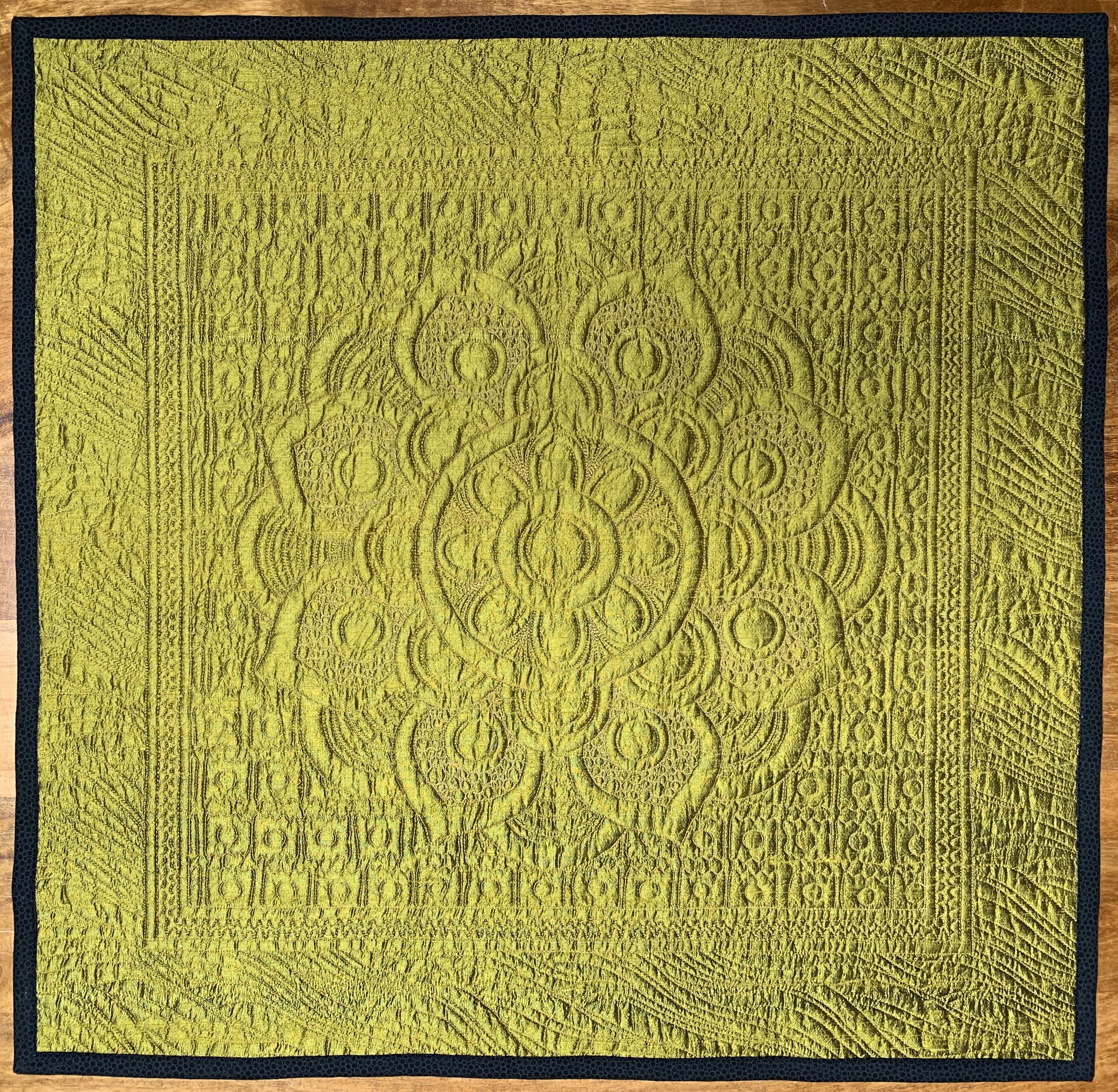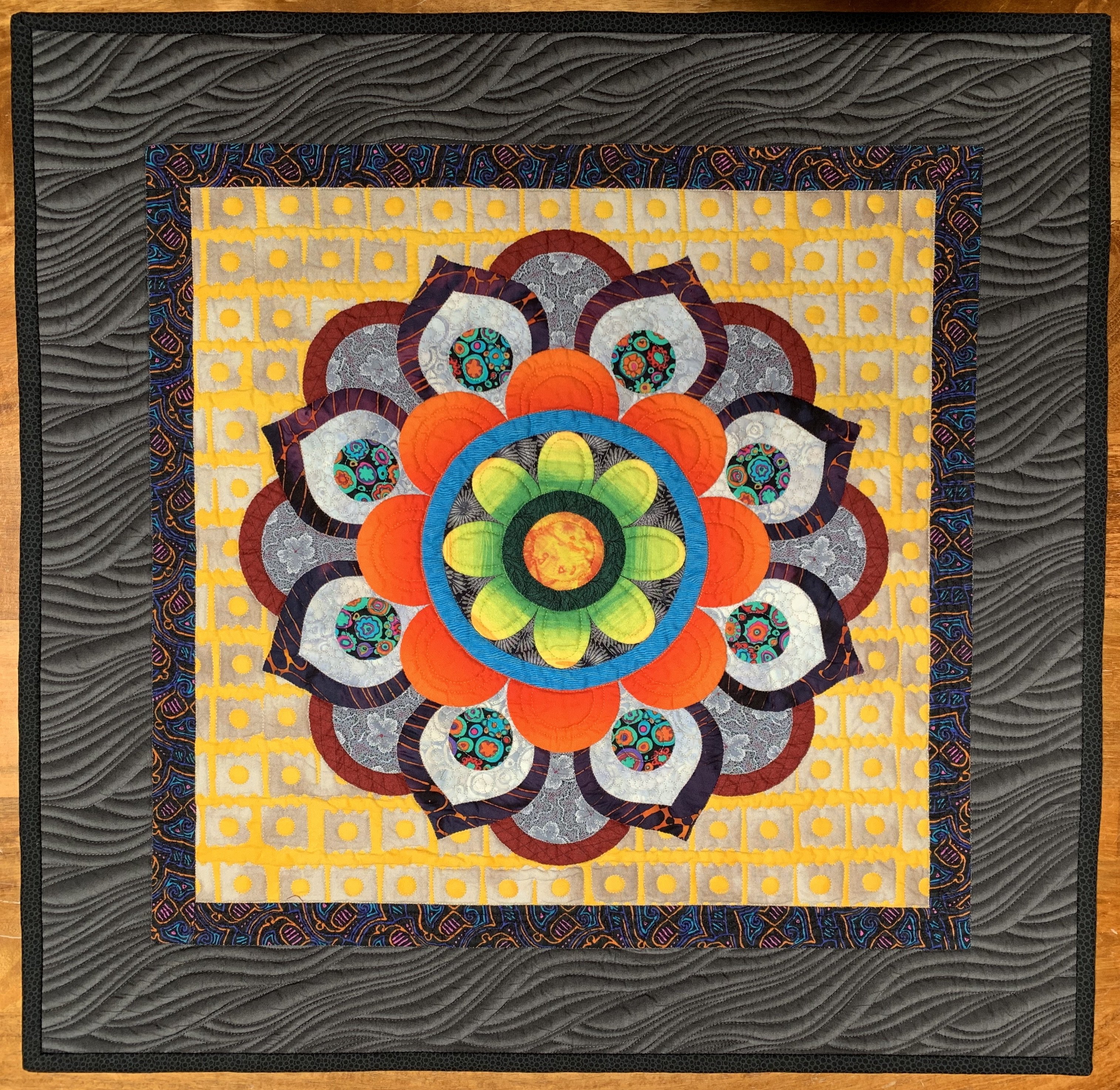 Mandala block finished with a simple border for a wall hanging. The mandala was machine appliqued and machine quilted. This was my first time using silk for the back of the quilt.