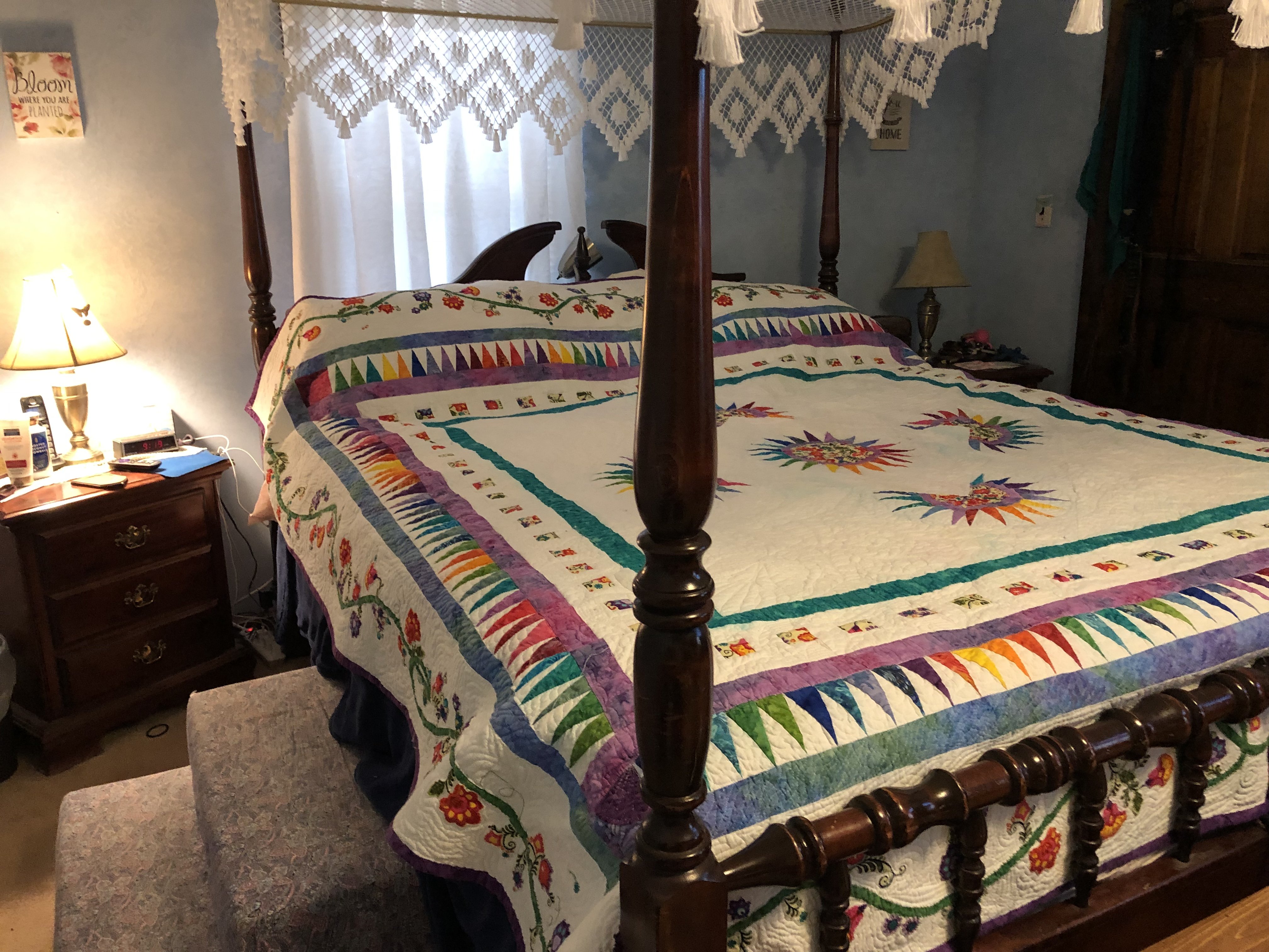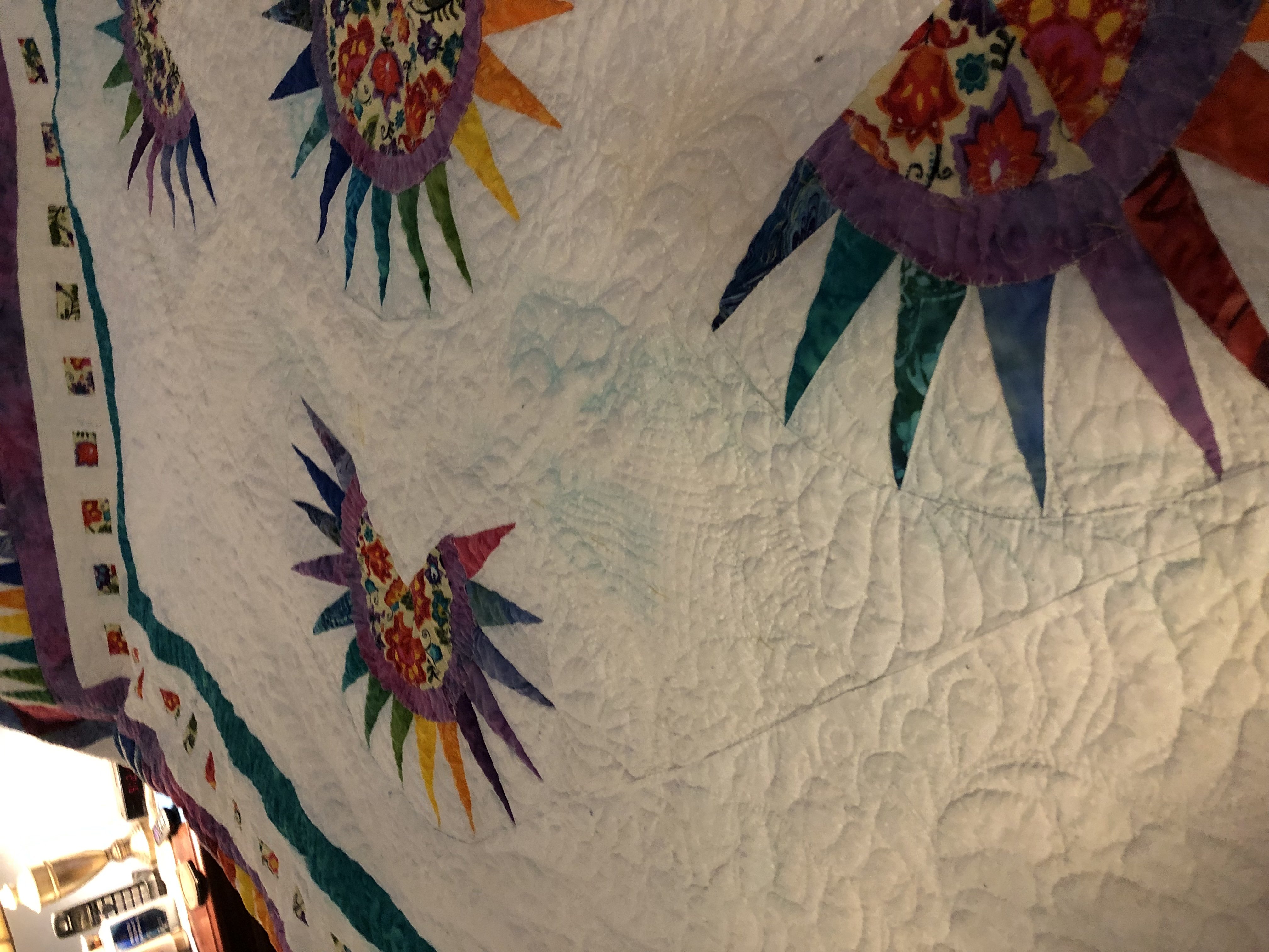 This is the quilt I made using Alex Anderson's paper piecing book. This labor of love took me 10 months to make on my Viking sewing machine. And 5 minutes to learn the lesson of a lifetime. I now am a firm believer in prewashing as you can see it bleed when I washed it.