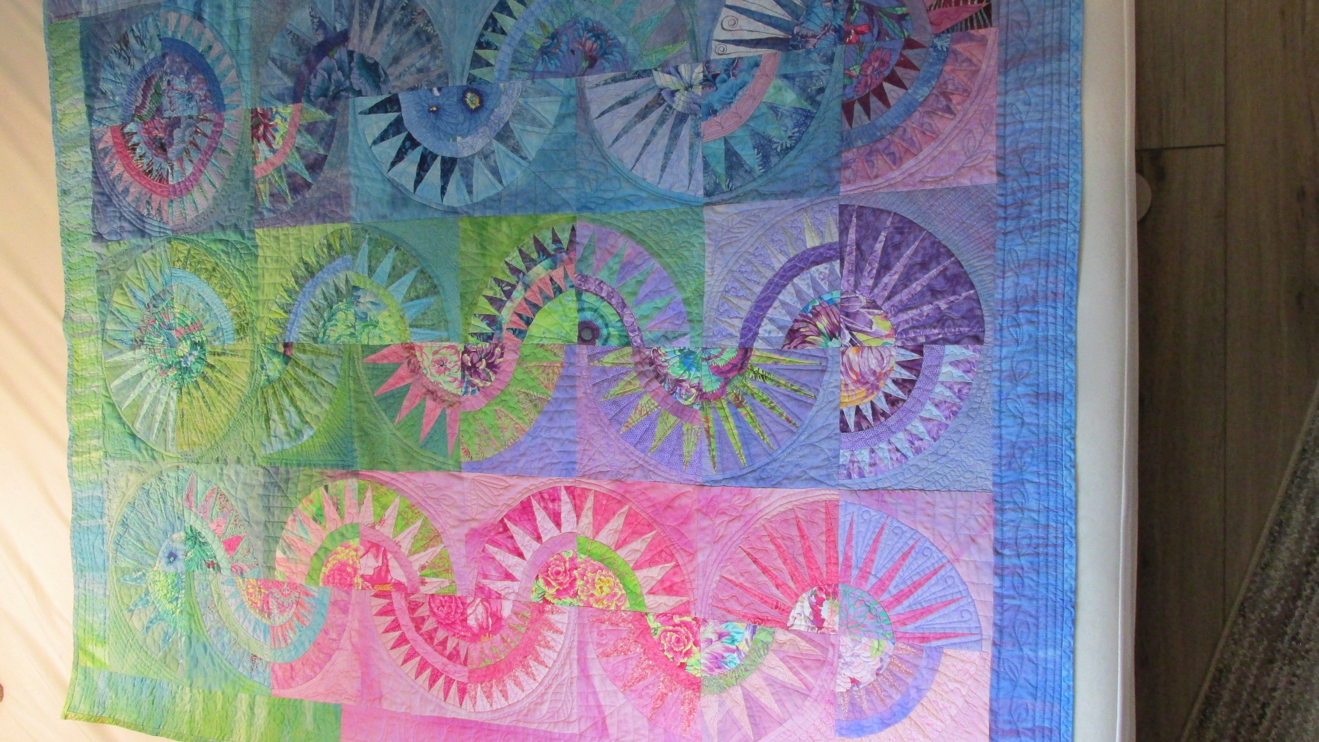 This Is all hand painted fabrics, I used embroidery threads to doodle quilt designs all over the top.