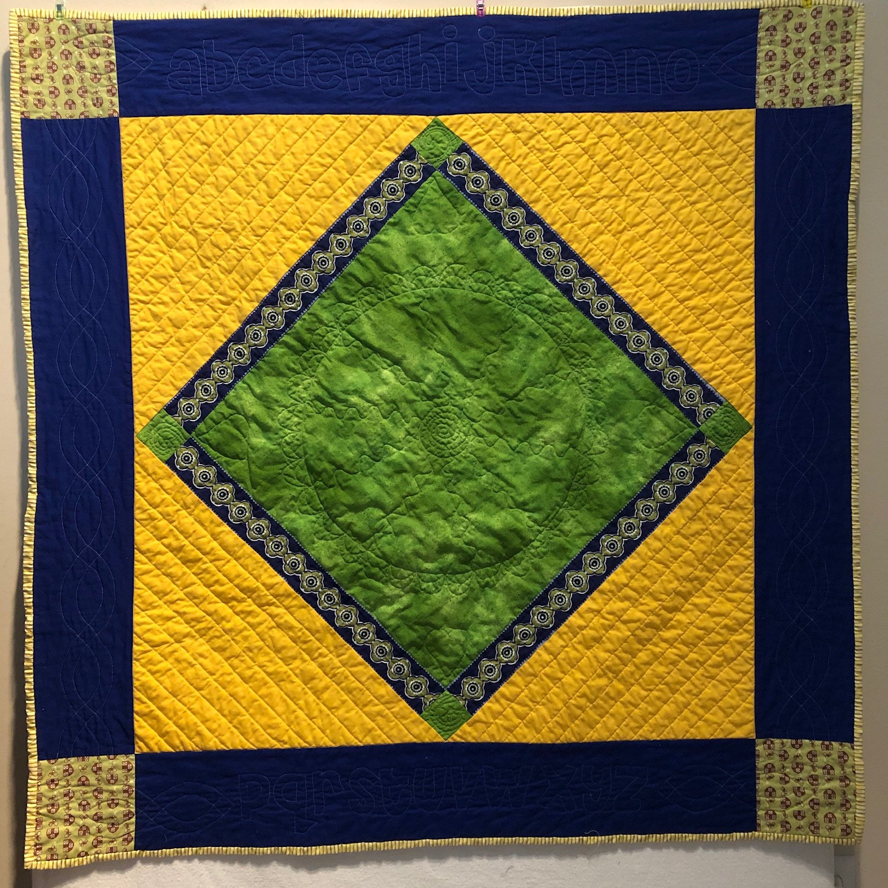 Baby quilt made for the first grandchild of church friends. Fussy cut the inner border from a frieze patterned striped fabric.