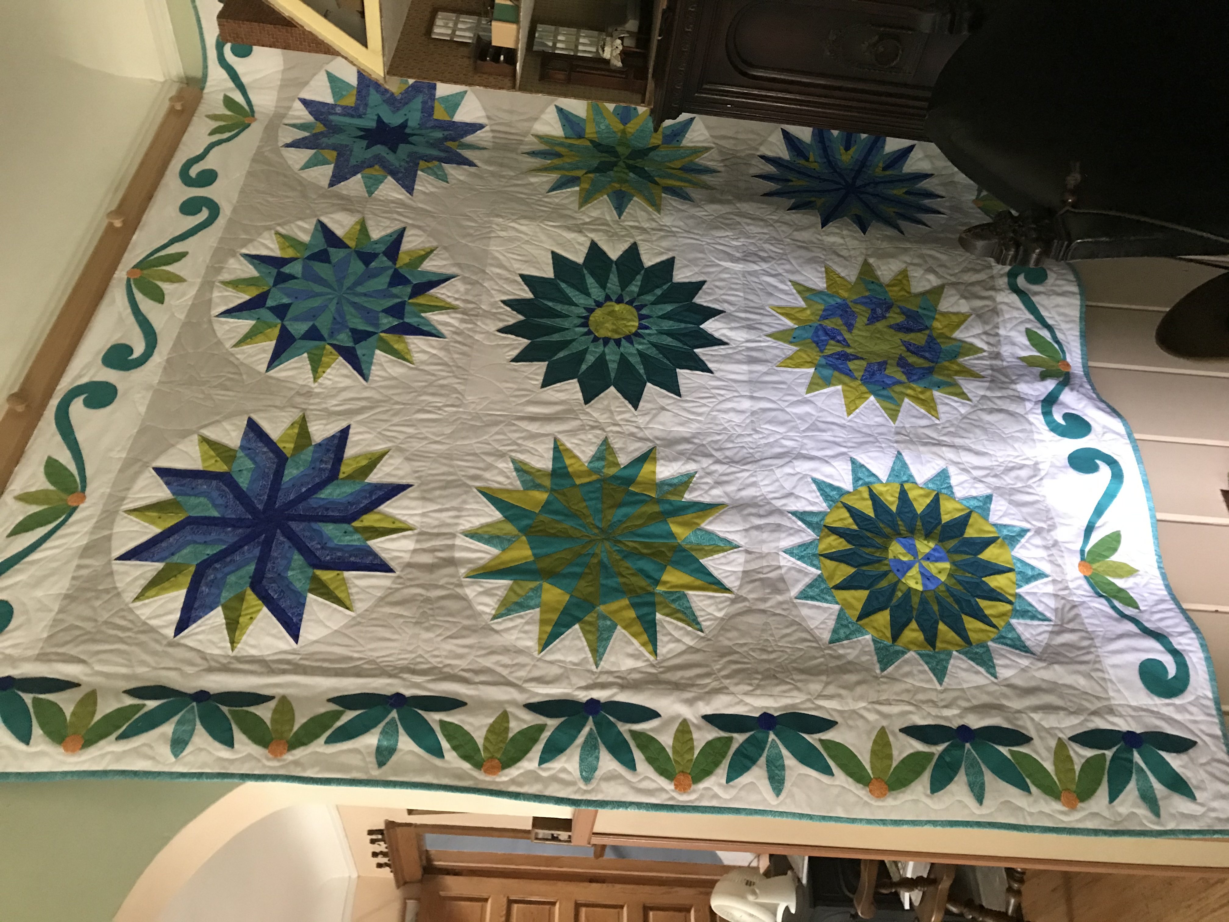 I finally finished quilting the block of the month 2019 quilt . I had the top down in December but was trying to get used to my Bernina Q 20. I think I did OK with the quilting.