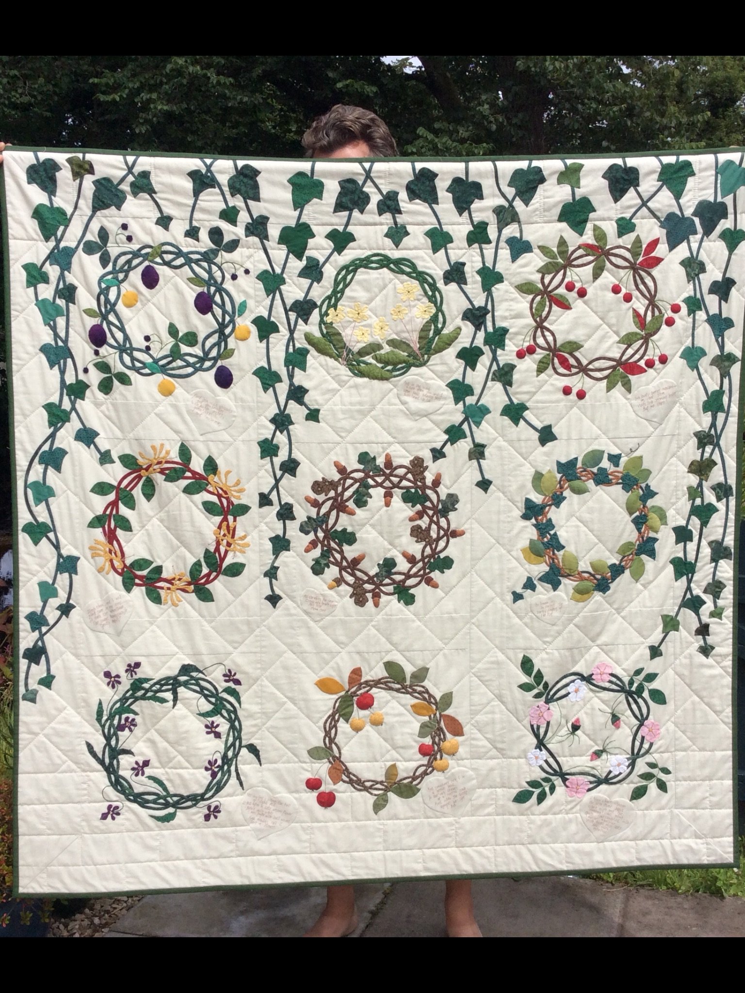 An homage to William Shakespeare. The wreaths are on a garden wall covered in ivy. Each wreath has a quote from Midsummer Night’s Dream and fruit or berries or flowers appropriate for the quote. All drawn by me from nature, hand applique and hand quilted. Took 3 years to complete.