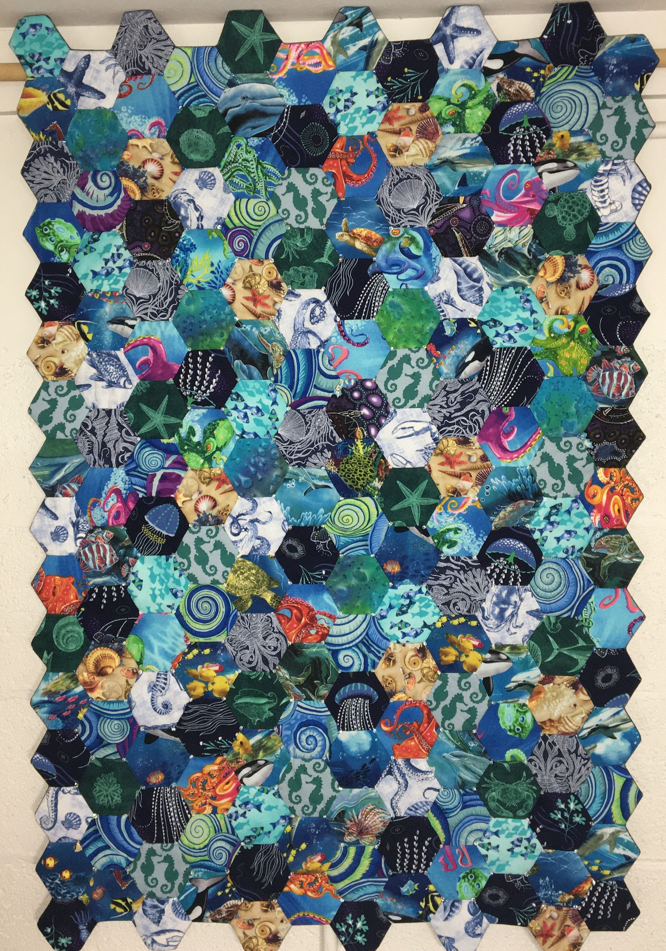 I started these hexagons last year from scraps, put them up on my design wall in February,and could not take them down until they were together. Quarantine happened so I hand pieced all through March then didn't want to cover the creatures with stitches so I faced it! Then 'quilted" it with beads in each point. Entered it in the Quarantine Quilts contest(not accepted) but covered every stitch on the back with lille fused circles, just in case. I Love looking at this quilt and I will never forget the circumstances in which it came to be!