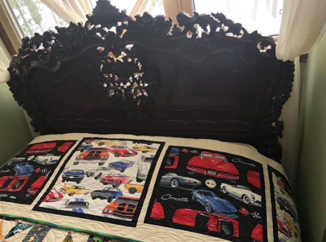I made this family quilt for a gentleman whose intention was to use it on this beautiful guest bed, and more importantly, to have it passed down through his family. I included fabrics that showed his many interests. Images of cats, chickens, fawns, and the many frogs that roam his country property. He enjoyed a trip to Hawaii, so I found pineapples and flowers. He loves cars, especially Corvettes. On eBay I found a Corvette fabric by Alexander Henry from the 1990s. It was used as part of the backing, so that when the top of the quilt is turned down the Corvettes are right side up, facing you.