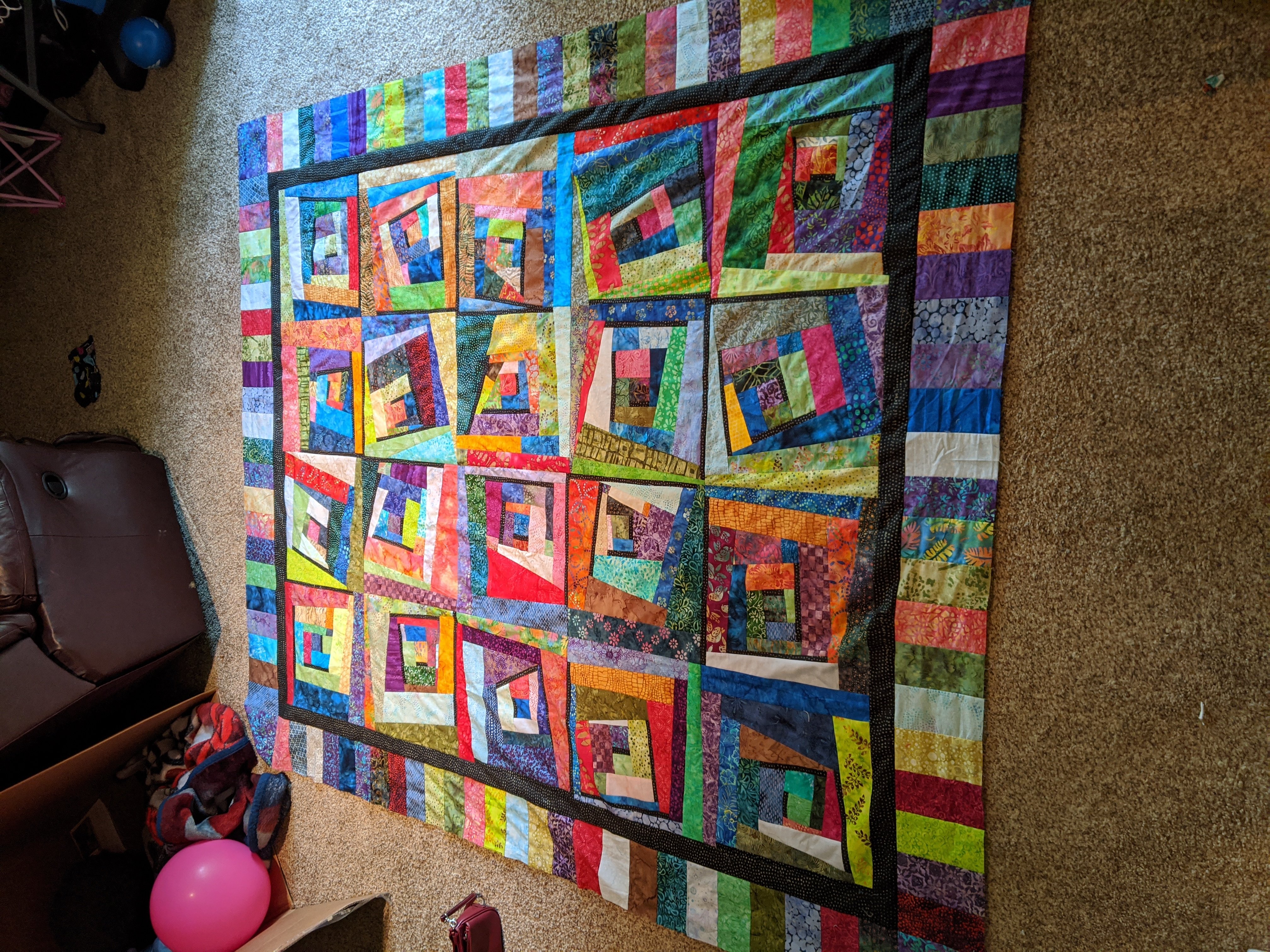 lilosmom I made this quilt from lots of batik scraps. I stuck them all in a big bucket, and the next one I pulled out is the next piece I used. I chain pieced all 12 blocks at the same time. I only had a couple of rules. I used a log cabin format, I wouldn't put the same piece in a block right next to each other. And I included a thin black line once on all four sides of the block. I had a great time, and it was very freeing! This was pretty out of the box for me.