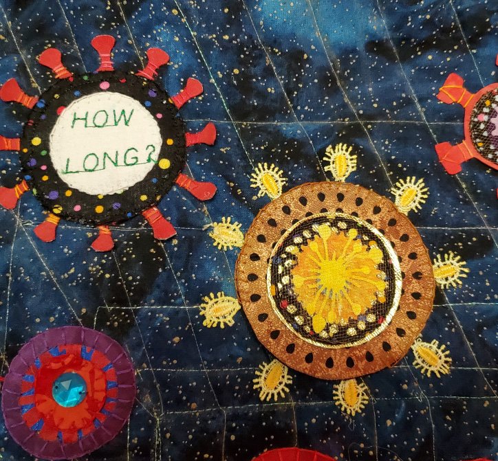 Designed in computer software, some shapes were cut with an electronic cutter. Applique, hand embroidery, machine quilting