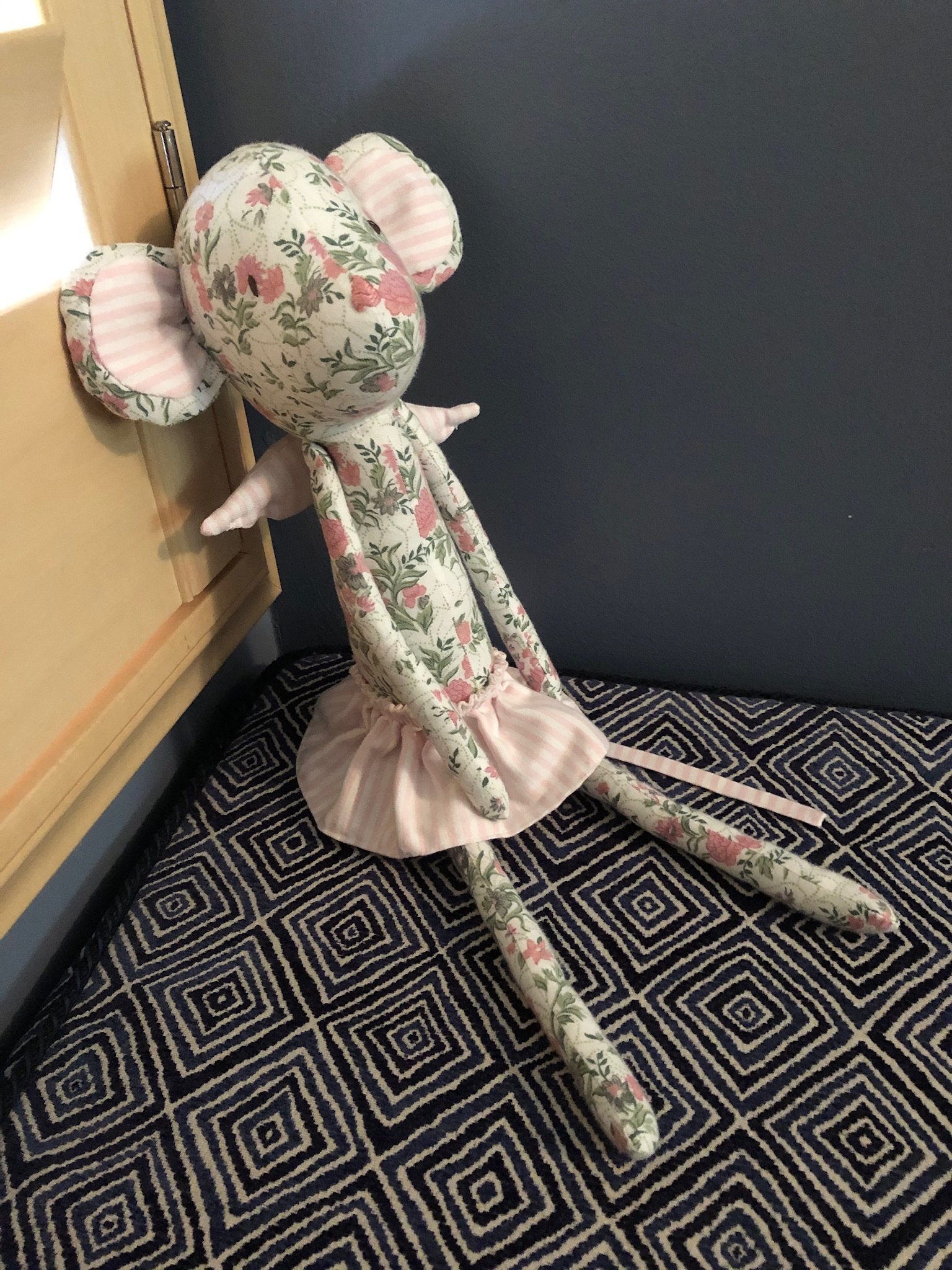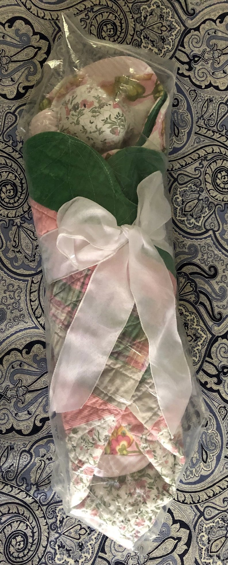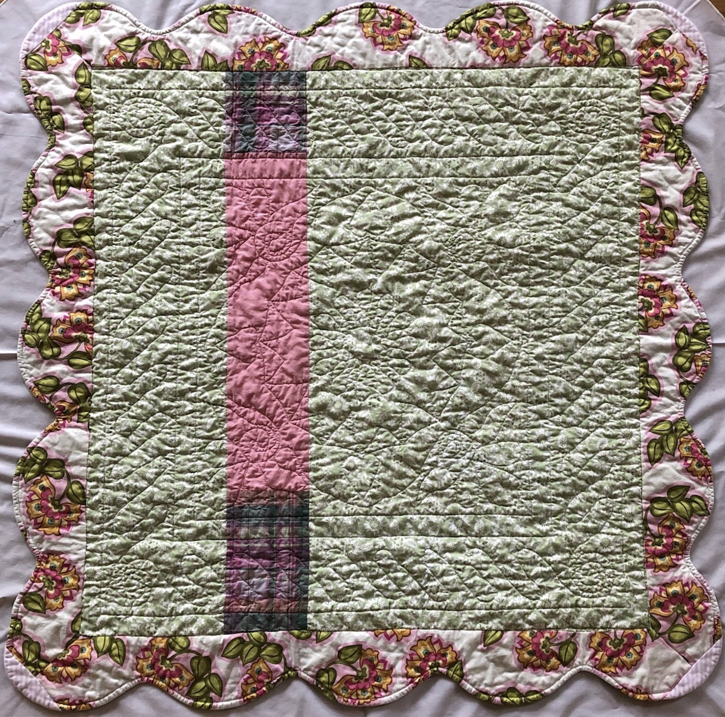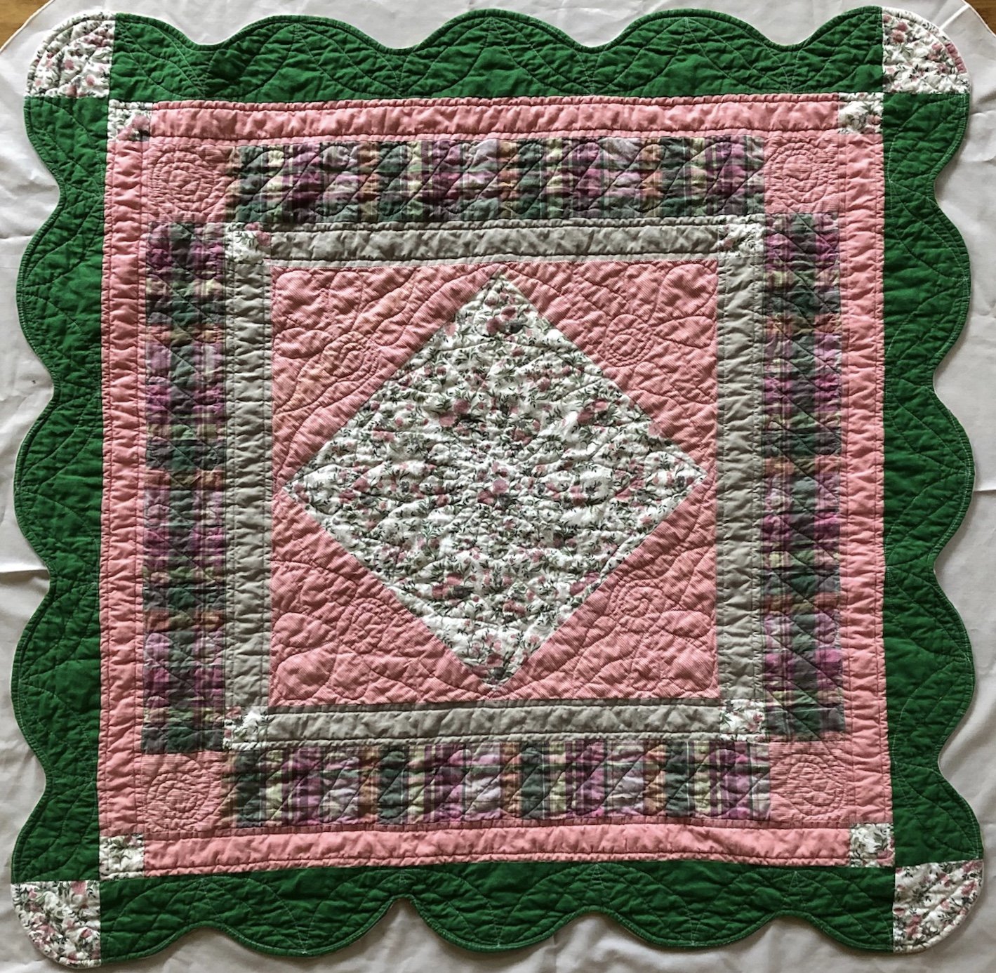 My second Diamond in a Square baby quilt. I love this quick and easy traditional pattern for baby quilts. This one is for a friend's newborn granddaughter, made completely of stash fabrics and to match a stuffed Tilda Angel Mouse that I also made for the baby. This is the first quilt that I've ever made with a scalloped edge. I used the technique of facing, rather than binding the quilt.