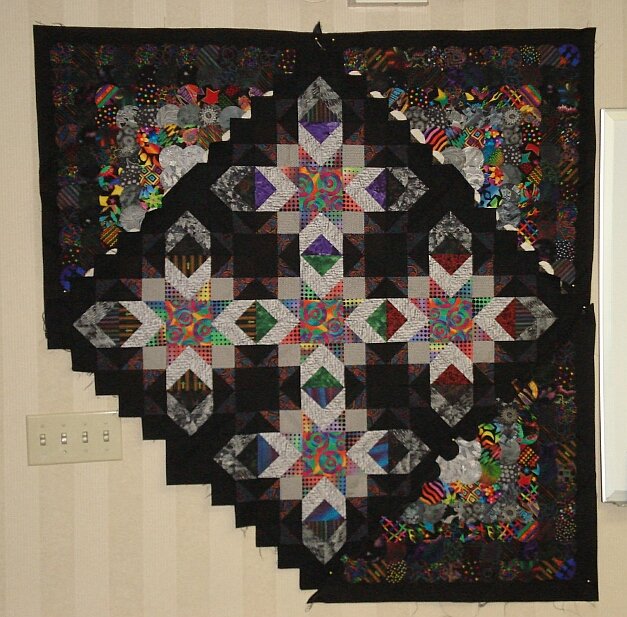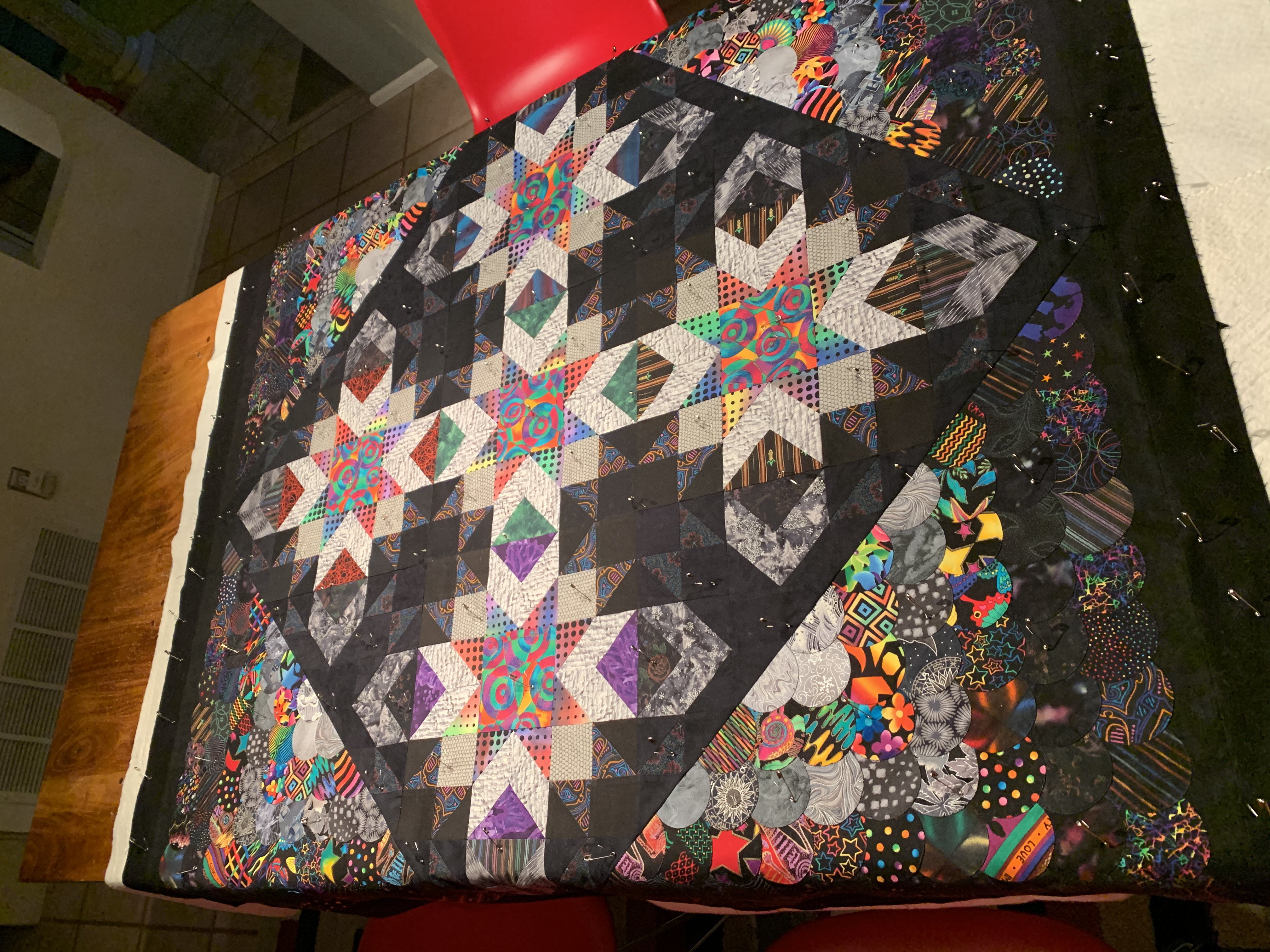 More than 20 years ago, I went to California and surprised Mom at a Road2CA Alex Anderson stars class. The five center medallion stars are from that class. Adding 4 diagonal half star blocks and 4 quarter star blocks created the center diamond. Machine appliqued clamshell corners finish the quilt back into a square. I loved playing with my colorful fabrics on a black ground color!