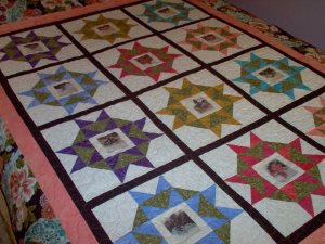 Four-Patch In A Square - Shirt Quilt - A vintage quilt on eBay was the source for this pattern. The fabrics are entirely gleaned from used (near-new) men's shirts and women's blouses. Even the stripey border is a shirt. I rather like the plain, homey look that these fabrics give the quilt. I machine quilt most of my quilts on this old Singer 15-91. The machine has a vertical bobbin which makes for good tension when moving the quilt around. Of course, it does not feature the computerized length of stitch nor speed control, but it does a reasonably good job for my quilts that are destined for hard use.