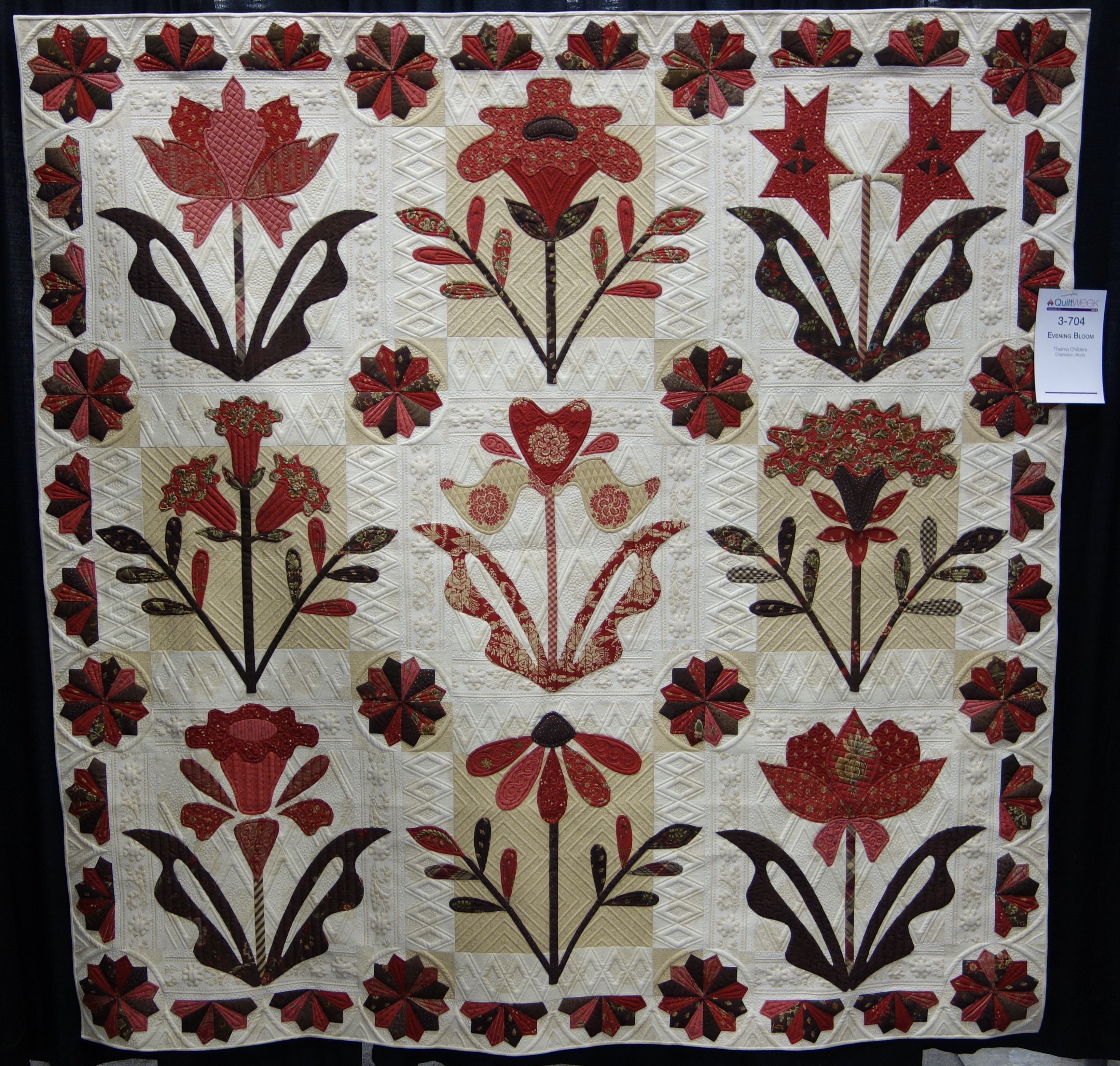 (80"x80") Thelma completed about 1 block a month after she learned hand applique. Amazing quilting (longarm) by Judy Madsen. Design Source: Evening Bloom Pattern from Country Inn by Barb Adams & Alma Allen of Blackbird Designs.
