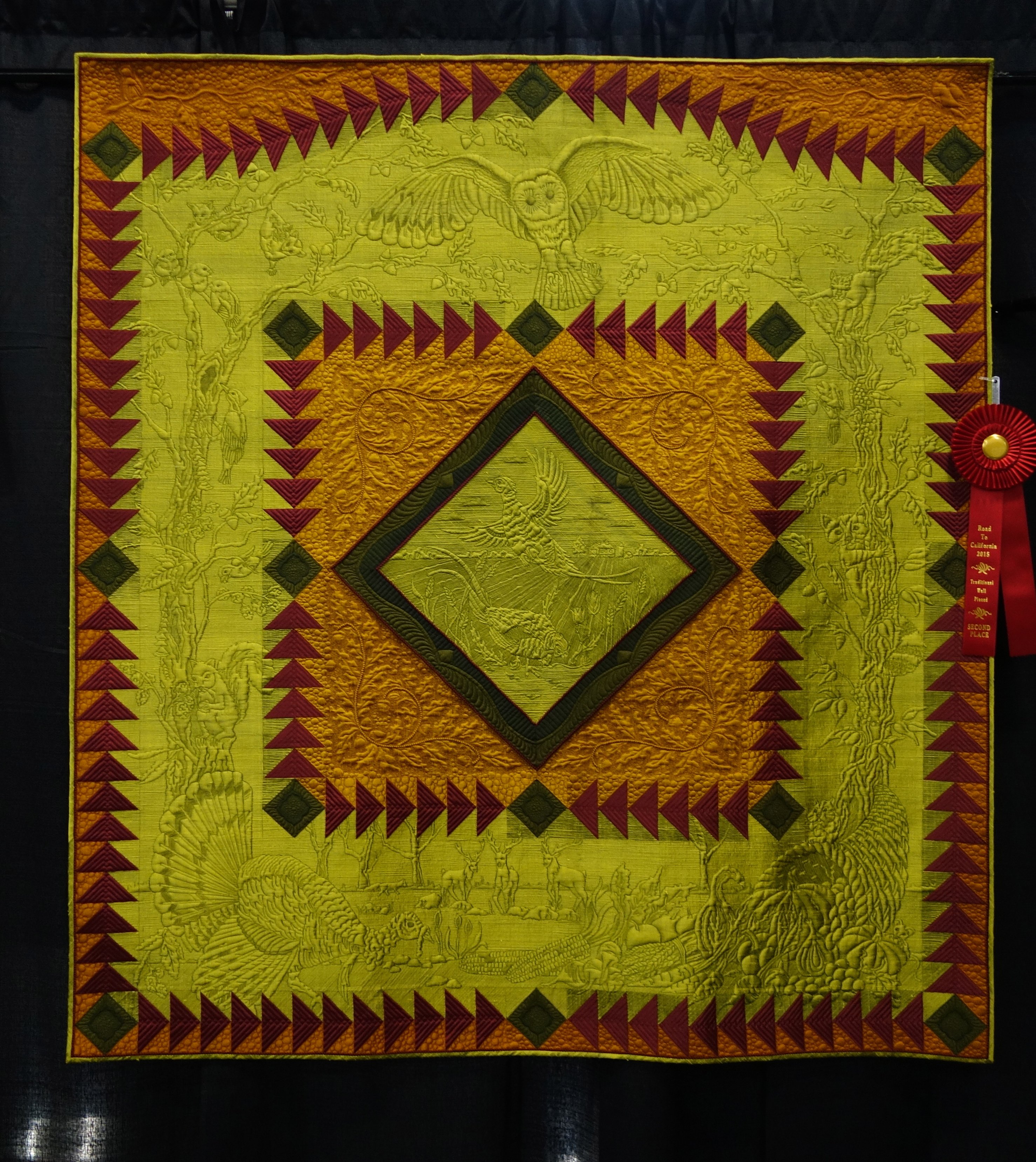 "October Sky" by Bethanne G. NemeshThis quilt was created in silk dupioni with Derwent Inktense pencils for shading. It is inspired by the beautiful state of Pennsylvania.