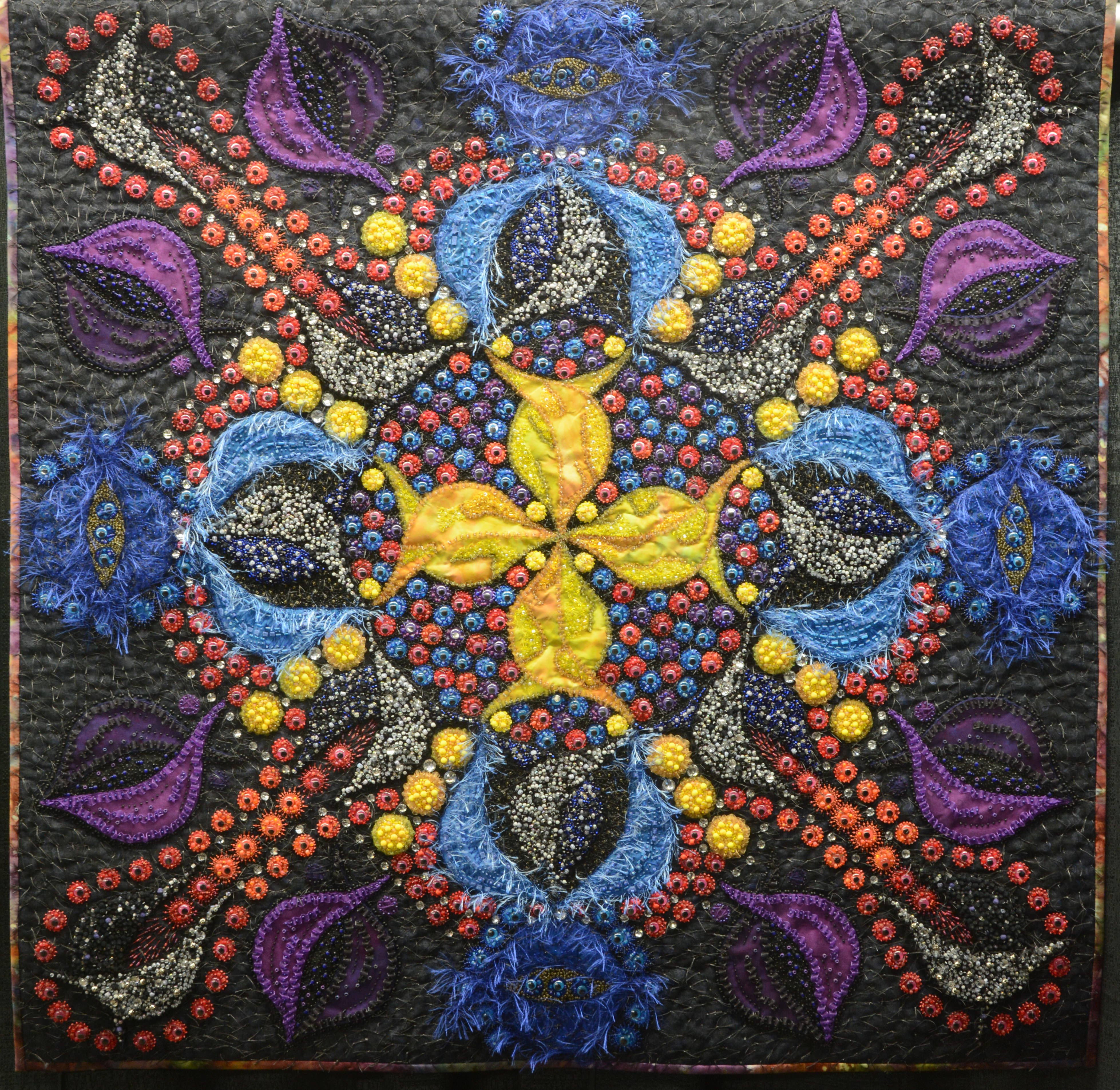 Janeene Herchold created Carnival by using a variety of surface embellishments to enhance the basic design shapes. She used beads, threads, ribbons, fabric paints and more to add dimensions and volume. The design is raw edge fused to the background and the shapes are couched around the edges for definition. Some shapes are filled with beads, pompoms, etc. for added volume. Everything was completed by hand with the machine used only to add the binding.