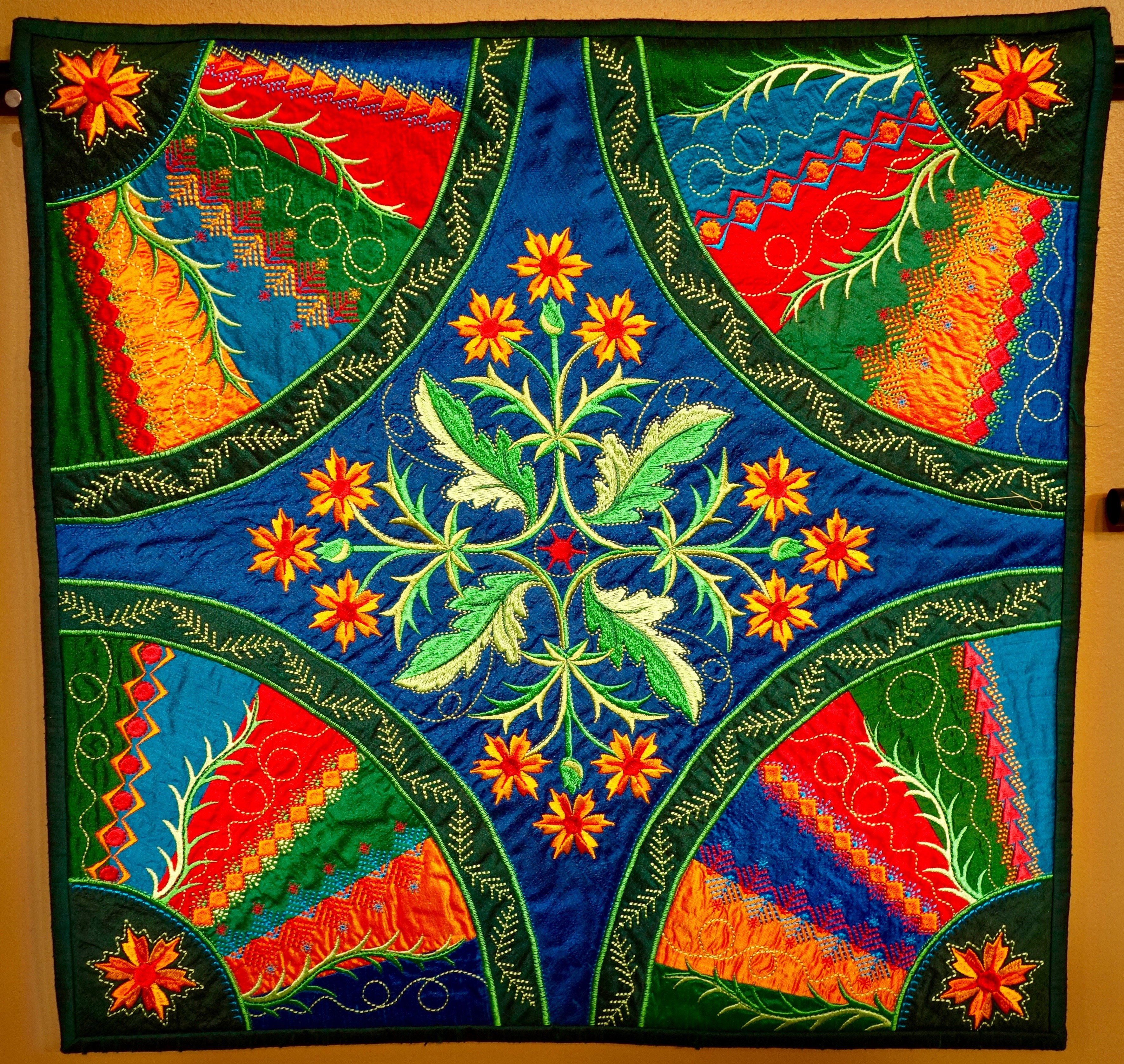 Love the colors and design, but particularly the crazy quilting on this quilt. It is a delight to the eye.