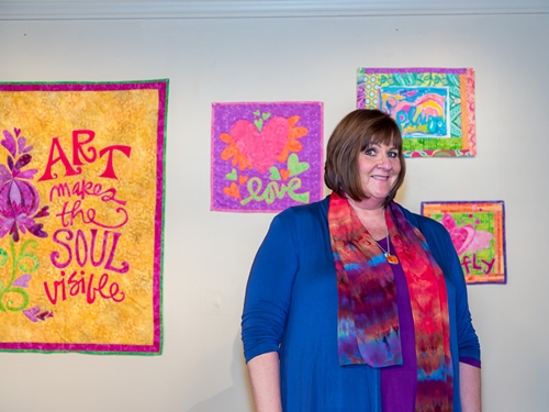 Posts On: May 11, 2015Joanne Sharpe’s quilts and fiber art pieces are filled with vibrant colors and joyous words. Her love of philosophy and her life work as an art teacher for all grade levels brings a special joie de vive to her work, which started on canvas and paper, and is now incorporating fabric. Joanne demonstrates how to use your own hand-written word to make a simple but unique small quilt. She also shows Ricky how to use Dyna-Flow dye to create a flower with a few easy brush strokes. Earlier in her career she designed holiday outdoor flags, and shares some of her products. On a field trip to Portland, TQS visits with Jennifer Murche, who creates incredible bowls with just fabric and thread. Learn her secrets and try it yourself!